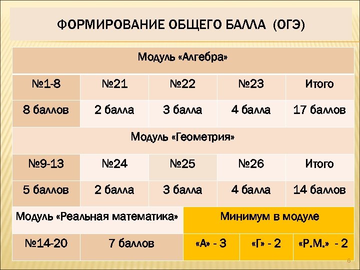 ФОРМИРОВАНИЕ ОБЩЕГО БАЛЛА (ОГЭ) Модуль «Алгебра» № 1 -8 № 21 № 22 № 23 Итого 8 баллов 2 балла 3 балла 4 балла 17 баллов Модуль «Геометрия» № 9 -13 № 24 № 25 № 26 Итого 5 баллов 2 балла 3 балла 4 балла 14 баллов Модуль «Реальная математика» № 14 -20 7 баллов Минимум в модуле «А» - 3 «Г» - 2 «Р. М. » - 2 6