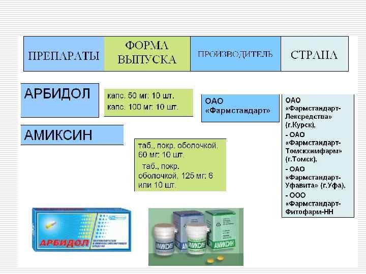 Индукторы интерферона o Циклоферон (табл. кишечнорастворимые 0, 15 г) – до еды 1 раз в сутки детям 4 -6 лет 1 табл. , 7 -11 лет-2 табл. , старше 11 лет-3 табл. Препарат вводится также в/м и в/в o Арбидол (табл. 0, 05; 0, 1, капс. 0, 1) – до еды 4 раза в сутки детям от 2 до 6 лет - 0, 05; 6 -12 лет - 0, 1; старше 12 лет – 0, 2 o Амиксин (тилорон - табл. 0, 06; 0, 125) – после еды старше 7 лет 0, 06 1, 2, 4 день при неосложненных формах (всего 3 табл. ), при осложненных - 4 табл. (+ на 6 день) o Неовир (амп. ) – 4 -6 мг/кг в/м