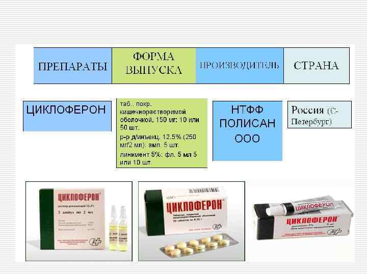 Препараты интерферонов o Реаферон-ЕС-липинт (рекомбинантный интерферон-а 2 b) для энтерального применения детям с 4 лет o Виферон-гель o Инфагель – мазь o Офтальмоферон - глазные капли (рекомбинантный интерферон-а 2 b) o Локферон - глазные капли (природный лейкоцитарный интерферон)