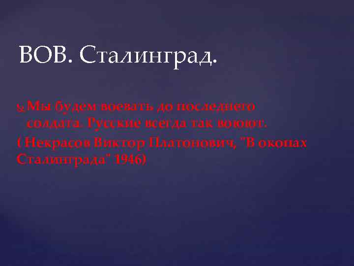 ВОВ. Сталинград. Мы будем воевать до последнего солдата. Русские всегда так воюют. ( Некрасов Виктор Платонович, "В окопах Сталинграда" 1946)