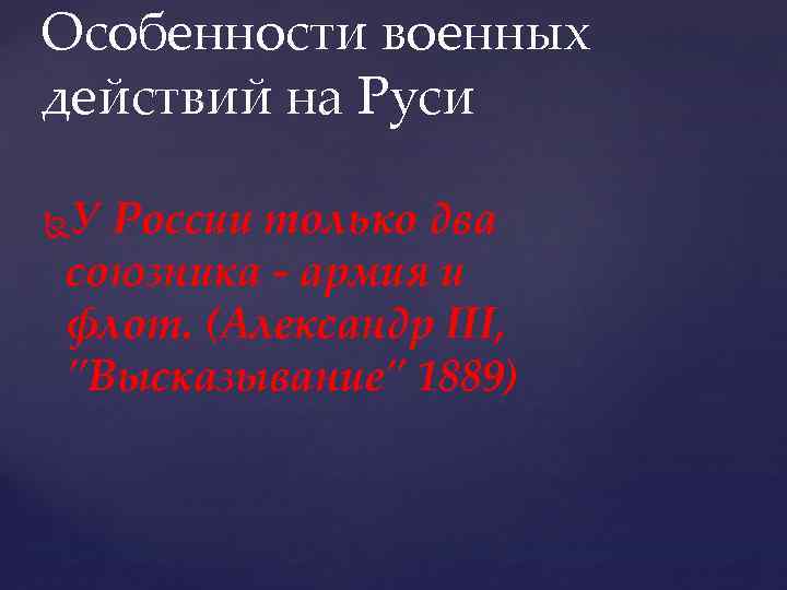 Особенности военных действий на Руси У России только два союзника - армия и флот. (Александр III, "Высказывание" 1889)
