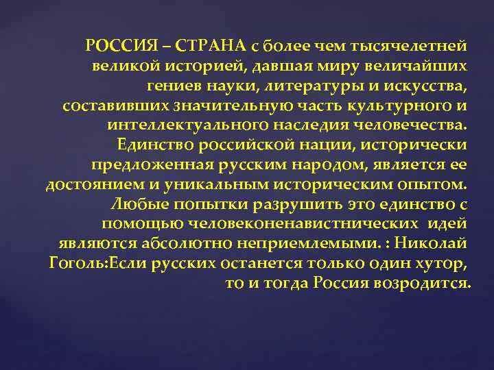 РОССИЯ – СТРАНА с более чем тысячелетней великой историей, давшая миру величайших гениев науки, литературы и искусства, составивших значительную часть культурного и интеллектуального наследия человечества. Единство российской нации, исторически предложенная русским народом, является ее достоянием и уникальным историческим опытом. Любые попытки разрушить это единство с помощью человеконенавистнических идей являются абсолютно неприемлемыми. : Николай Гоголь: Если русских останется только один хутор, то и тогда Россия возродится.