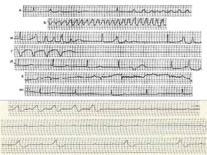 ИНСТРУМЕНТАЛЬНЫЕ МЕТОДЫ ДИАГНОСТИКИ. • ЭКГ: 1. Дисфункция САУ – СБ, остановки САУ, СА блокада. Отсутствие дыхательной аритмии. 2. Замедление вп проводимости. 3. Нарушения АВ проводимости. 4. Снижение амплитуды комплекса QRS. 5. Замедление вж проводимости и процессов реполяризации желудочков - увеличение продолжительности QRS и QT. 6. Признаки коронарной недостаточности – уплощение и инверсия зубцов Т, депрессия или элевация сегмента ST.