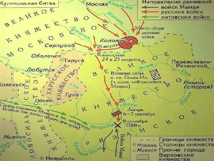 • • • — III этап Вторая половина XIV в. В 60— 70 -е гг. XIV в. князю Дмитрию, внуку Ивана Калиты, удалось решить в пользу Москвы целый ряд давних и очень важных проблем. 1) были отбиты притязания соседних князей на великое княжение. Ярлык остался в Москве. 2) удалось отвести военную угрозу со стороны великого княжества Литовского. 3) Москва добилась решающего перевеса над своим традиционным соперником, Тверским княжеством. 4) впервые за более чем столетие московский князь почувствовал себя достаточно сильным, чтобы пойти на открытый конфликт с Ордой, бросить ей вызов, оперевшись на поддержку большинства русских княжеств и земель. — IV этап Куликовская битва(1380) Москва укрепилась в своей роли объединительницы русских земель