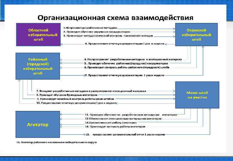 Обязанности агитатора • проведение первичного опрашивания (о потребностях района, отношение к выборам, поддержка идей партии); • сбор наказов и гражданских инициатив в поддержку ПР; • раздача информационных материалов на встречах с избирателями; • проведение агитационных бесед при поквартирном обходе ОДД; • формирование списков однозначных сторонников с их телефонами; • отчет перед бригадиром; • ведение маршрутной карты; • регистрация действий соперников и слухов, которые ходят в округе; • реализация мероприятий по прекращению слухов - распространение необходимой информации, запуск контрслухов.