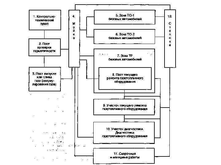 За основу переходной схемы принимается организация технологического процесса по типовой схеме 2 (см. рис. 2). Автомобиль проходит через КТП, пост проверки герметичности газовой системы питания и пост выработки газа, мойку, при необходимости через пост выпуска (слива) газа и дегазации. Затем ГБА поступает в помещение производственной зоны, соответствующее требованиям пожарной безопасности и приспособленное для ТО и ТР ГБА и его газобаллонного оборудования. Ремонт газовой аппаратуры выполняется на специально оборудованном посту на карбюраторном или на дизельном участке