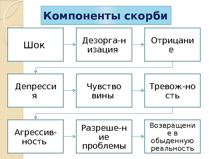 Компоненты скорби Шок Дезорга-н изация Отрицани е Депресси я Чувство вины Тревож-но сть Агрессив- ность Разреше-н ие проблемы Возвращени е в обыденную реальность