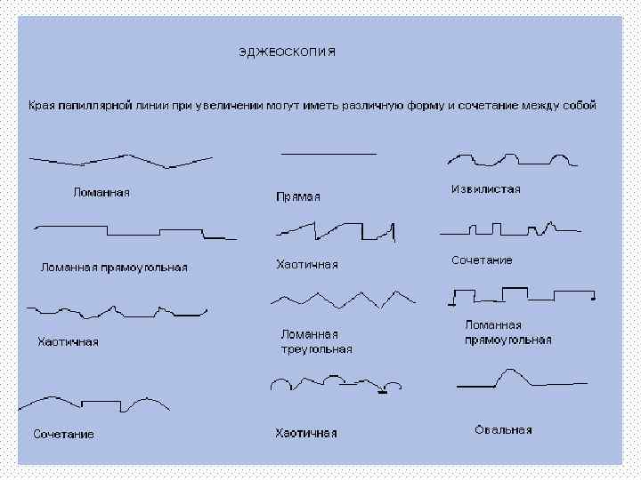 Доказано, что форма края папиллярной линии имеет свои особенности, сочетания по видам и строго индивидуальна, что позволяет использовать этот метод для идентификационных исследований. При микроскопическом увеличении папиллярных линий в 20 — 25 раз наблюдаются неровности их краев в виде выступов, впадин, изгибов и т. п. , которые служат дополнительными идентификационными признаками.