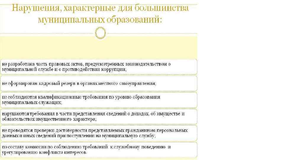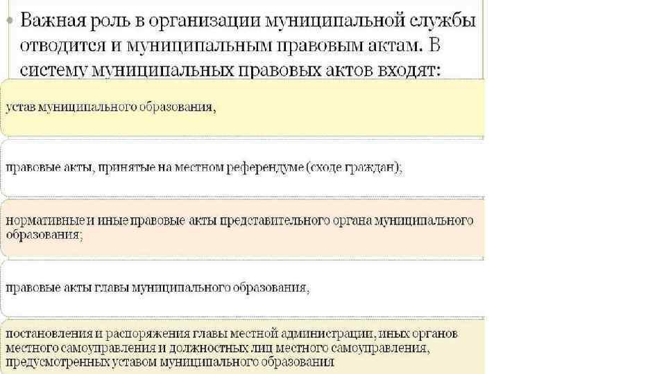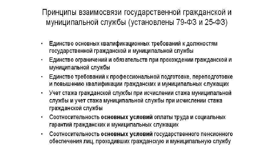 Принципы муниципальной службы 1) верховенство Конституции РФ, федеральных законов и законов субъектов Федерации над иными нормативными актами (инструкциями, положениями); 2) приоритет прав и свобод человека и гражданина и их непосредственное прямое действие; 3) самостоятельность органов местного самоуправления в пределах своих полномочий; 4) профессионализм и компетентность муниципальных служащих; 5) ответственность муниципальных служащих за неисполнение или ненадлежащее исполнение своих должностных обязанностей; 6) равный доступ граждан к муниципальной службе в соответствии с их способностями и профессиональной подготовкой; 7) единство основных требований и положений муниципальной службы, действующих в России, с учетом местных особенностей и традиций; 8) правовая и социальная защищенность муниципальных служащих; 9) внепартийность муниципальной службы и недопустимость контроля муниципальной службы партийными и иными организациями.