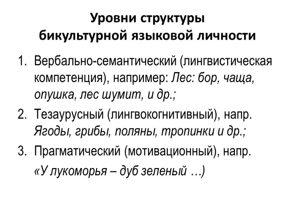 Уровни структуры бикультурной языковой личности Вербально-семантический (лингвистическая компетенция), например: Лес: бор, чаща, опушка, лес шумит, и др.; Тезаурусный (лингвокогнитивный), напр. Ягоды, грибы, поляны, тропинки и др.; Прагматический (мотивационный), напр. «У лукоморья – дуб зеленый …)