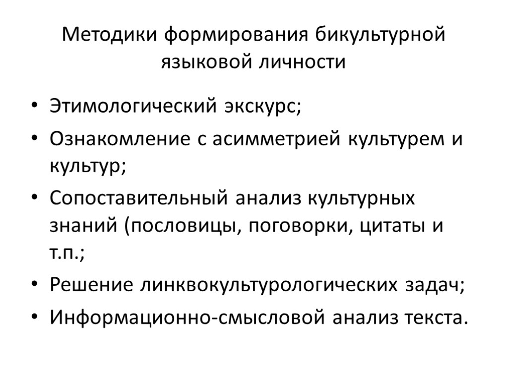 Методики формирования бикультурной языковой личности Этимологический экскурс; Ознакомление с асимметрией культурем и культур; Сопоставительный анализ культурных знаний (пословицы, поговорки, цитаты и т.п.; Решение линквокультурологических задач; Информационно-смысловой анализ текста.