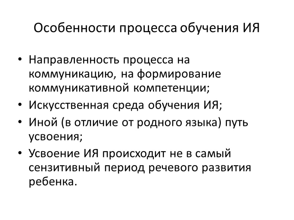 Особенности процесса обучения ИЯ Направленность процесса на коммуникацию, на формирование коммуникативной компетенции; Искусственная среда обучения ИЯ; Иной (в отличие от родного языка) путь усвоения; Усвоение ИЯ происходит не в самый сензитивный период речевого развития ребенка.