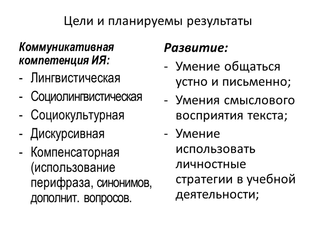 Цели и планируемы результаты Коммуникативная компетенция ИЯ: Лингвистическая Социолингвистическая Социокультурная Дискурсивная Компенсаторная (использование перифраза, синонимов, дополнит. вопросов. Развитие: Умение общаться устно и письменно; Умения смыслового восприятия текста; Умение использовать личностные стратегии в учебной деятельности;