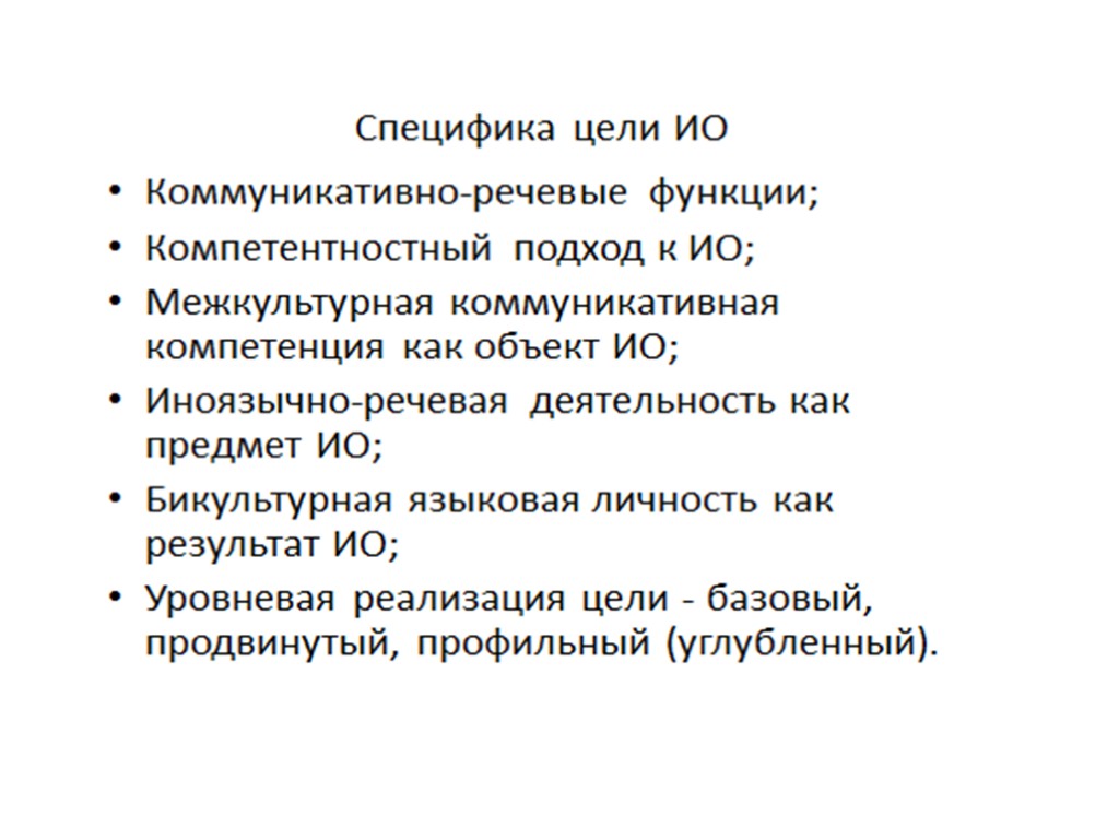 Особенности предмета ИЯ, отраженные в современной цели обучения Предмет обучения – иноязычная речевая деятельность; Объект обучения – межкультурная коммуникация; Модель овладения ИЯ – концепт би-, поликультурной языковой личности; Межпредметный характер предмета ИЯ в школе.