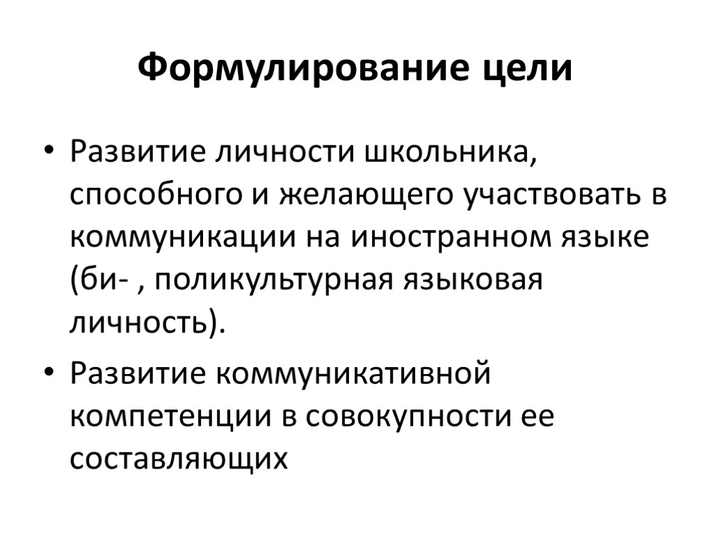 Формулирование цели Развитие личности школьника, способного и желающего участвовать в коммуникации на иностранном языке (би- , поликультурная языковая личность). Развитие коммуникативной компетенции в совокупности ее составляющих
