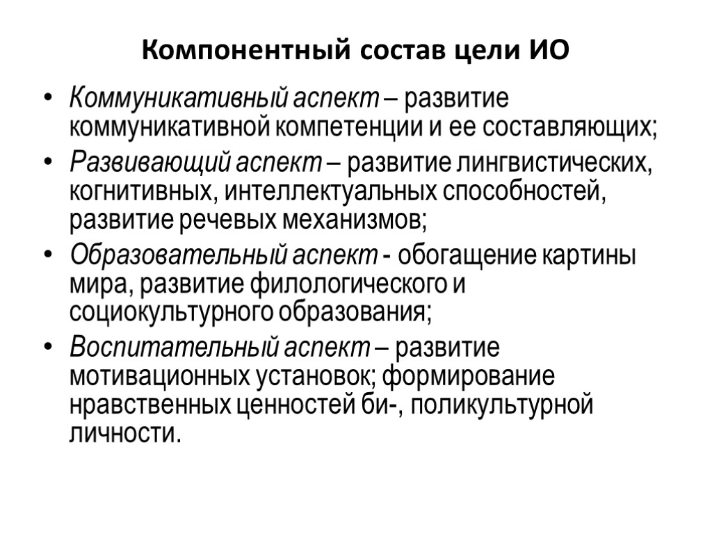 Компонентный состав цели ИО Коммуникативный аспект – развитие коммуникативной компетенции и ее составляющих; Развивающий аспект – развитие лингвистических, когнитивных, интеллектуальных способностей, развитие речевых механизмов; Образовательный аспект - обогащение картины мира, развитие филологического и социокультурного образования; Воспитательный аспект – развитие мотивационных установок; формирование нравственных ценностей би-, поликультурной личности.