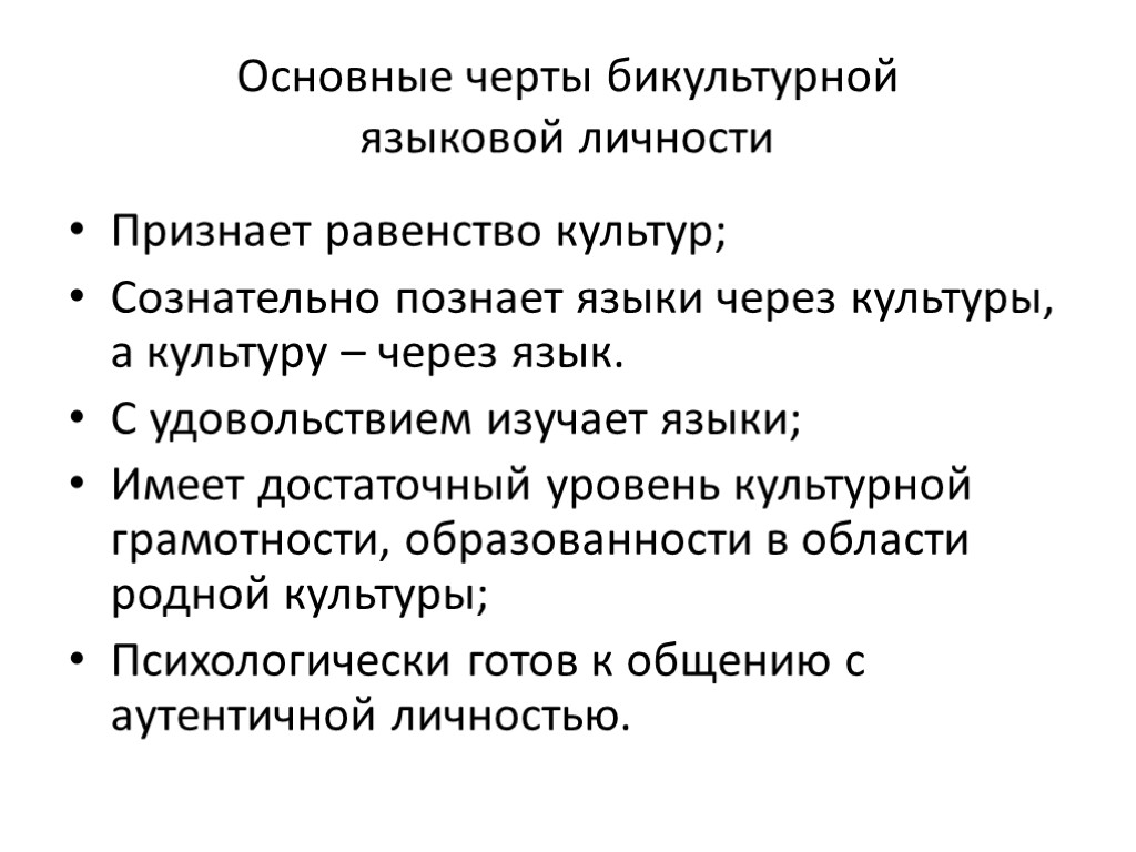 Основные черты бикультурной языковой личности Признает равенство культур; Сознательно познает языки через культуры, а культуру – через язык. С удовольствием изучает языки; Имеет достаточный уровень культурной грамотности, образованности в области родной культуры; Психологически готов к общению с аутентичной личностью.