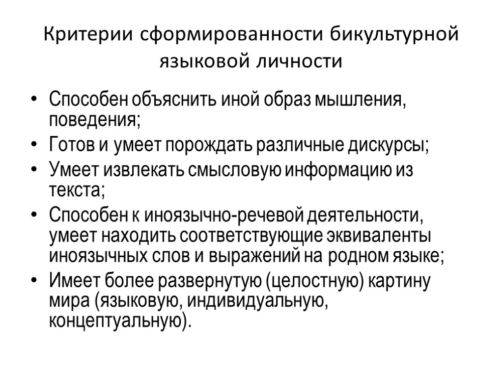 Критерии сформированности бикультурной языковой личности Способен объяснить иной образ мышления, поведения; Готов и умеет порождать различные дискурсы; Умеет извлекать смысловую информацию из текста; Способен к иноязычно-речевой деятельности, умеет находить соответствующие эквиваленты иноязычных слов и выражений на родном языке; Имеет более развернутую (целостную) картину мира (языковую, индивидуальную, концептуальную).