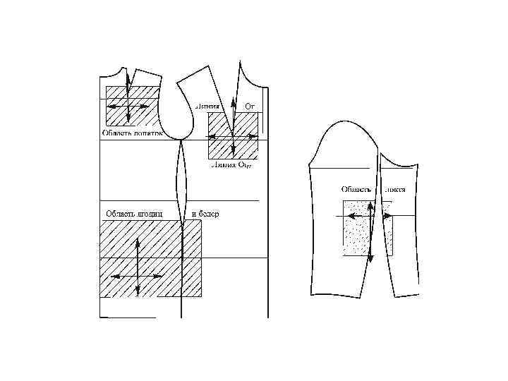 Кожа подвергается формованию (двуосному растяжению) в зонах наиболее выпуклых участков конструкции: • в области груди; • в области лопаток (ниже конца плечевой вытачки спинки на 2, 5– 3, 0 см и ниже уровня лопаток на 2, 5– 3, 0 см); • в области ягодиц (от уровня подъягодичной складки до линии, проходящей ниже линии талии на 8– 10 см); • в области наиболее выступающих точек бёдер; • на рукаве в области локтя.