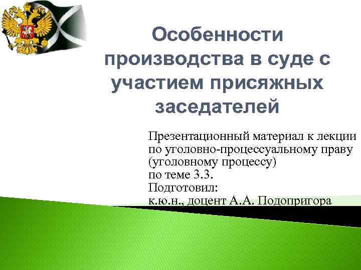 Особенности производства в суде с участием присяжных заседателей Презентационный материал к лекции по уголовно-процессуальному праву (уголовному процессу) по теме 3. 3. Подготовил: к. ю. н. , доцент А. А. Подопригора