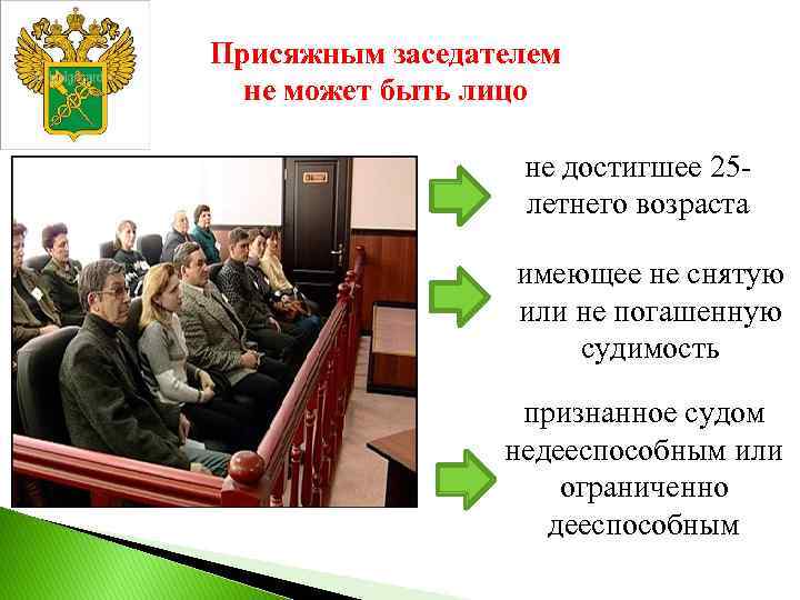 Присяжным заседателем не может быть лицо не достигшее 25 летнего возраста имеющее не снятую или не погашенную судимость признанное судом недееспособным или ограниченно дееспособным