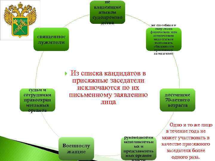 не владеющие языком судопроизво дства не способные в силу своих физических или психических недостатков выполнять обязанности присяжных заседателей священнос лужители судьи и сотрудники правоохран ительных органов Из списка кандидатов в присяжные заседатели исключаются по их письменному заявлению лица Военнослу жащие руководители исполнительн ых и представитель ных органов достигшие 70 -летнего возраста Одно и то же лицо в течение года не может участвовать в качестве присяжного заседателя более одного раза.