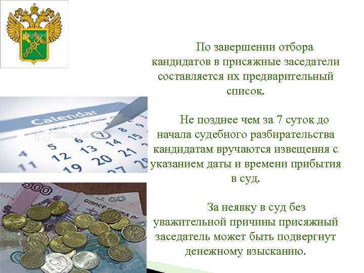 По завершении отбора кандидатов в присяжные заседатели составляется их предварительный список. Не позднее чем за 7 суток до начала судебного разбирательства кандидатам вручаются извещения с указанием даты и времени прибытия в суд. За неявку в суд без уважительной причины присяжный заседатель может быть подвергнут денежному взысканию.
