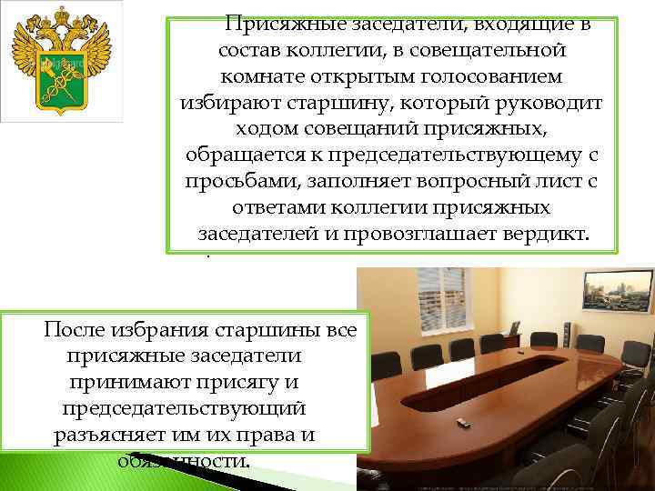 Присяжные заседатели, входящие в состав коллегии, в совещательной комнате открытым голосованием избирают старшину, который руководит ходом совещаний присяжных, обращается к председательствующему с просьбами, заполняет вопросный лист с ответами коллегии присяжных заседателей и провозглашает вердикт. . После избрания старшины все присяжные заседатели принимают присягу и председательствующий разъясняет им их права и обязанности.