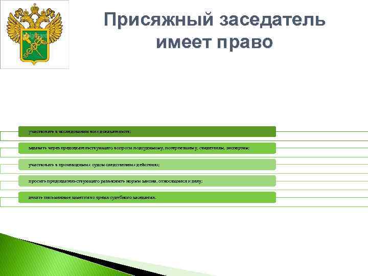 Присяжный заседатель имеет право участвовать в исследовании всех доказательств; задавать через председательствующего вопросы подсудимому, потерпевшему, свидетелям, экспертам; участвовать в производимых судом следственных действиях; просить председательствующего разъяснить нормы закона, относящиеся к делу; делать письменные заметки во время судебного заседания.