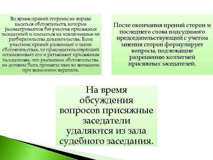 Во время прений стороны не вправе касаться обстоятельств, которые рассматриваются без участия присяжных заседателей и ссылаться на исключенные из разбирательства доказательства. Если участник прений упоминает о таких обстоятельствах, то председательствующий останавливает его и разъясняет присяжным заседателям, что указанные обстоятельства не должны быть приняты ими во внимание при вынесении вердикта. После окончания прений сторон и последнего слова подсудимого председательствующий с учетом мнения сторон формулирует вопросы, подлежащие разрешению коллегией присяжных заседателей. На время обсуждения вопросов присяжные заседатели удаляются из зала судебного заседания.