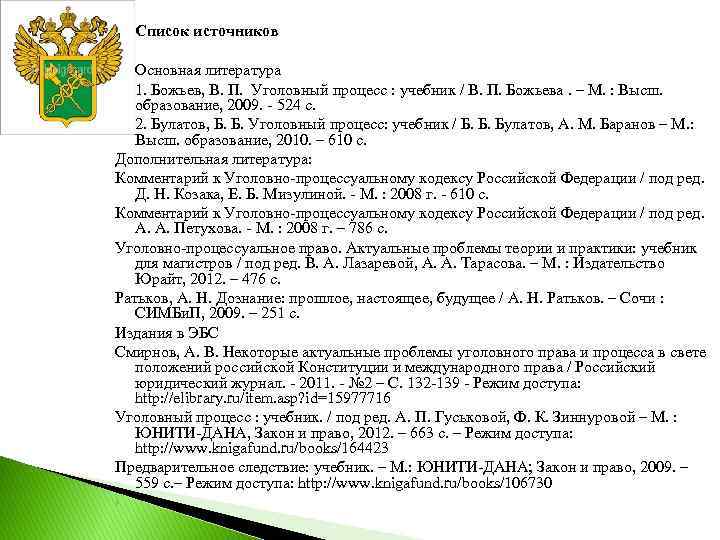 Список источников Основная литература 1. Божьев, В. П. Уголовный процесс : учебник / В. П. Божьева. – М. : Высш. образование, 2009. - 524 с. 2. Булатов, Б. Б. Уголовный процесс: учебник / Б. Б. Булатов, А. М. Баранов – М. : Высш. образование, 2010. – 610 с. Дополнительная литература: Комментарий к Уголовно-процессуальному кодексу Российской Федерации / под ред. Д. Н. Козака, Е. Б. Мизулиной. - М. : 2008 г. ‑ 610 с. Комментарий к Уголовно-процессуальному кодексу Российской Федерации / под ред. А. А. Петухова. - М. : 2008 г. – 786 с. Уголовно-процессуальное право. Актуальные проблемы теории и практики: учебник для магистров / под ред. В. А. Лазаревой, А. А. Тарасова. – М. : Издательство Юрайт, 2012. – 476 с. Ратьков, А. Н. Дознание: прошлое, настоящее, будущее / А. Н. Ратьков. – Сочи : СИМБи. П, 2009. – 251 с. Издания в ЭБС Смирнов, А. В. Некоторые актуальные проблемы уголовного права и процесса в свете положений российской Конституции и международного права / Российский юридический журнал. - 2011. - № 2 – С. 132 -139 - Режим доступа: http: //elibrary. ru/item. asp? id=15977716 Уголовный процесс : учебник. / под ред. А. П. Гуськовой, Ф. К. Зиннуровой – М. : ЮНИТИ-ДАНА, Закон и право, 2012. – 663 с. – Режим доступа: http: //www. knigafund. ru/books/164423 Предварительное следствие: учебник. – М. : ЮНИТИ-ДАНА; Закон и право, 2009. – 559 с. – Режим доступа: http: //www. knigafund. ru/books/106730