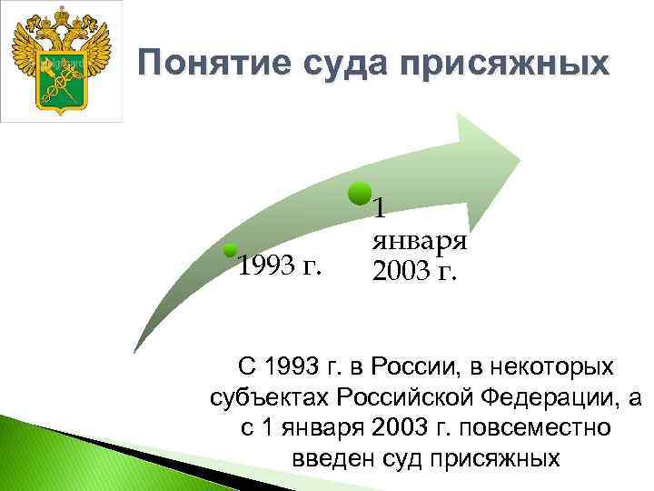 Понятие суда присяжных 1993 г. 1 января 2003 г. С 1993 г. в России, в некоторых субъектах Российской Федерации, а с 1 января 2003 г. повсеместно введен суд присяжных