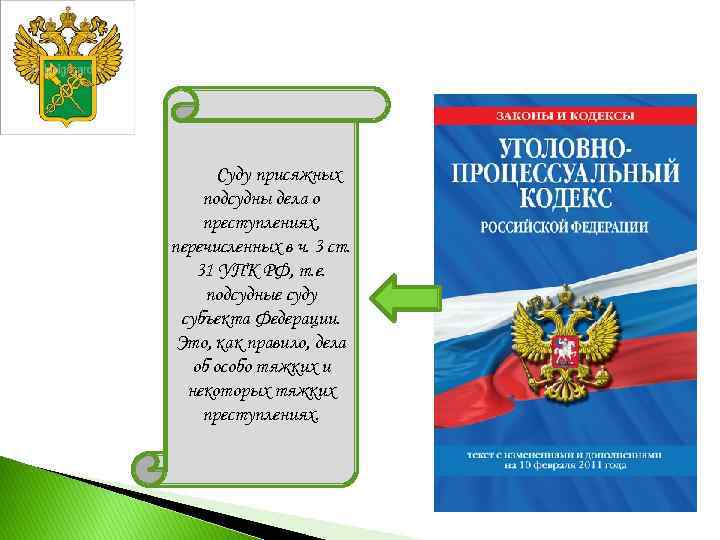 Суду присяжных подсудны дела о преступлениях, перечисленных в ч. 3 ст. 31 УПК РФ, т. е. подсудные суду субъекта Федерации. Это, как правило, дела об особо тяжких и некоторых тяжких преступлениях.