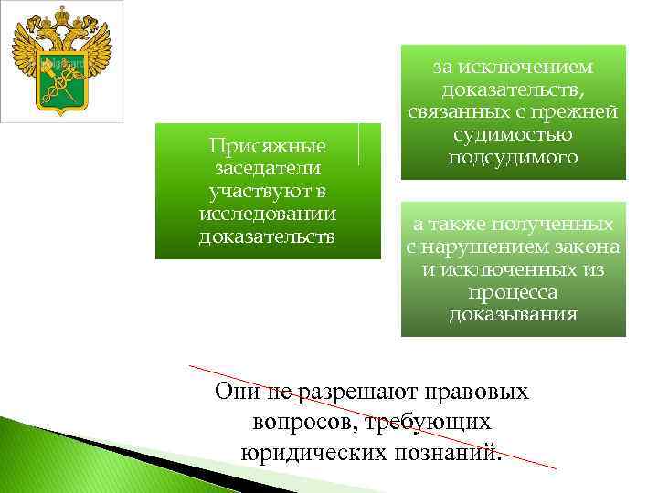 Присяжные заседатели участвуют в исследовании доказательств за исключением доказательств, связанных с прежней судимостью подсудимого а также полученных с нарушением закона и исключенных из процесса доказывания Они не разрешают правовых вопросов, требующих юридических познаний.