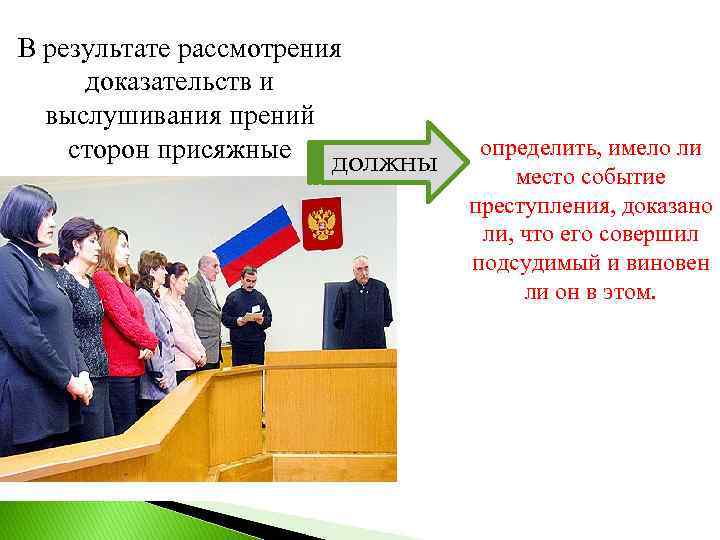 В результате рассмотрения доказательств и выслушивания прений сторон присяжные должны определить, имело ли место событие преступления, доказано ли, что его совершил подсудимый и виновен ли он в этом.