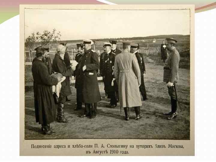 СТОЛЫПИНСКАЯ АГРАРНАЯ РЕФОРМА (1906 – 1911 гг. ) Реформа надельного крестьянского землевладения. Цель - создание класса земельных собственников как социальной опоры самодержавия и противника революционных движений «Сначала успокоение, потом реформа» (П. А. Столыпин) Итоги Составные части аграрной реформы -К 1916 г. из общины выделилось 25 -27 % крестьянских дворов - Рост сельскохозяйственного производства и увеличение экспорта хлеба за границу -Разрешение выхода крестьян из общины с правом закрепления в частную собственность принадлежавших им земельных наделов в форме хутора или отруба - Передача Крестьянскому банку казенных земель для продажи их нуждающимся крестьянам - Организация переселенческого движения в Западную Сибирь с целью наделения безземельных и малоземельных крестьян землей - Широкое строительство сельских школ и вовлечение в систему народного образования огромных масс населения Значительная часть крестьянства не приняла реформы Последствия Противоречивые результаты реформы Причины незавершенности реформы -Незначительные временные сроки - Сопротивление со стороны правых и левых политических сил - Сложное взаимоотношения окружения царя и П. А. Столыпина -Ускорение процесса расслоения крестьянства - Разрушение крестьянской общины Убийство П. А. Столыпина