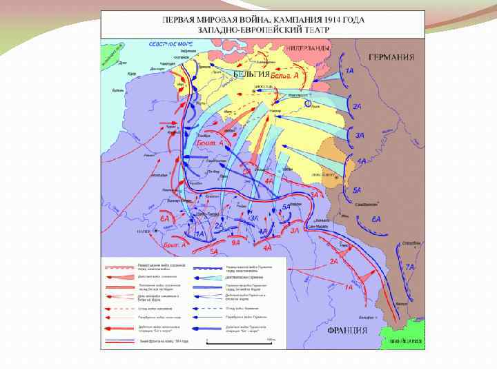 Соотношение сил перед началом войны Для реализации плана Шлиффена по быстрому разгрому Франции Германия сосредоточила на границе с Францией, Бельгией и Люксембургом значительные военные силы: были развёрнуты семь армий (1 -я — 7 -я, 86 пехотных и 10 кавалерийских дивизий, до 5 тыс. орудий) численностью около 1 млн. 600 тыс. человек под командованием императора Вильгельма II. Армии союзников: французские силы насчитывали пять армий (1 -я — 5 -я, 76 пехотных и 10 кавалерийских дивизий, более 4 тыс. орудий) численностью около 1730 тыс. человек под командованием генерала Жозефа Жоффра. бельгийская армия (шесть пехотных и одна кавалерийская дивизия, 312 орудий) численностью 117 тыс. человек под командованием короля Альберта I; британская экспедиционная армия (4 пехотных и 1, 5 кавалерийских дивизии, 328 орудий) численностью 87 тыс. человек под командованием фельдмаршала Джона Френча.