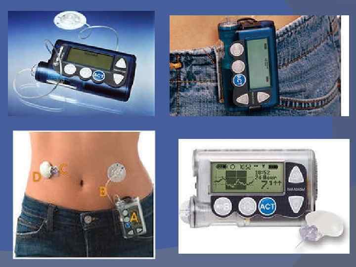 Инсулиновая помпа Суть метода –п/к устанавливается тонкая канюля. Канюля ч/з катетер (тонкую пластиковую трубку) соединяется с резервуаром с инсулином- находится в инсулиновой помпе. Помпа с помощью поршня и миниатюрного электрического мотора с очень малой скоростью постоянно «подаёт» очень малые дозы инсулина через катетер и канюлю п/к - практически сразу всасываются. Не формируется депо инсулина под кожей. Помпа размерами с 2/3 мобильного телефона носится постоянно, даже ночью.
