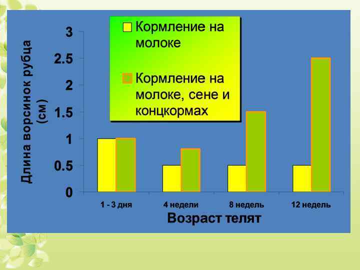 Зерновой корм При попадании зерновых частиц корма в рубец, в нем заселяется микрофлора, которая перерабатывает углеводы зерна в летучие жирные кислоты. Оптимальным является потребление зернового корма в трехмесячном возрасте от 1 до 1, 5 кг. Объемистые корма. Приучение к поеданию сена следует начинать с 3 недели. Дачу сена увеличивают с ростом теленка, к трех месячному возрасту доводят до 1 кг. Если теленок нормально адаптировался к потреблению грубого корма, скорость его развития и живая масса должны постоянно увеличиваться. Раннее приучение к зерновому корму положило начало развитию рубцового пищеварения, грубый корм способствует дальнейшему развитию рубцовой микрофлоры и увеличению объема рубца.