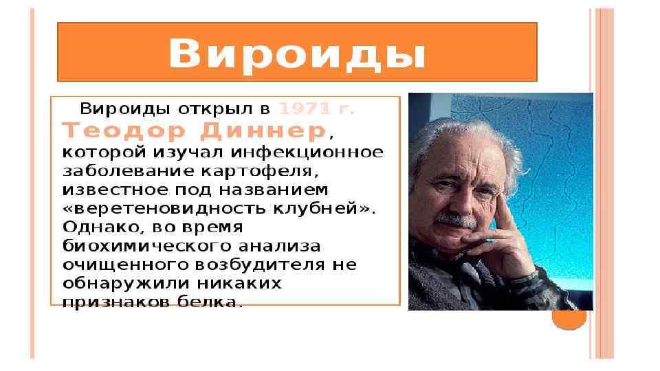 ОТЛИЧАЮТСЯ ОТ ВИРУСОВ: • 1. Не имеют белковой оболочки и не обладают антигенными свойствами; • 2. РНК отличается малыми размерами (длиной около 1 х10 -6 мм), состоит из 300 -400 нуклеотидов; самые маленькие способные к размножению единицы в природе • 3. Геном представлен кольцевой одноцепочечной РНК. Среди вирусов позвоночных подобную структуру имеет только геном вируса гепатита Дельта (гепатита D); • 4. Вироиды не кодируют собственных белков и их размножение происходит либо автокаталитически, либо зависит от клетки-хозяина. • Вироиды способны автономно инфицировать клетки хозяина. Распространение вироидов происходит механическим путем (в т. ч. насекомыми), при вегетативном размножении и прививании растений, с помощью семян, спор и пыльцы. • Считается, что вироиды представляют собой «сбежавшие интроны» - вырезанные в ходе сплайсинга пре-м. РНК. Вироиды заражают растения персистентно, они вызывают системную инфекцию, т. е. мигрируют из места внедрения в другие части растений, переносятся механически или через клеточный сок, семена, пыльцу. • Используются в качестве векторов в генной инженерии растений. • Первый вироид (вироид веретеновидности клубней картофеля) обнаружен в 1971 г. Т. Дайнером.