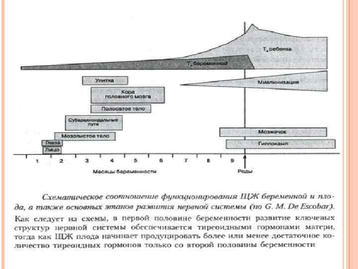 ФУНКЦИОНИРОВАНИЕ ЩИТОВИДНОЙ ЖЕЛЕЗЫ ВО ВРЕМЯ БЕРЕМЕННОСТИ 1)Гиперстимуляция ЩЖ ХГ а) физиологическое снижение уровня ТТГ в первой половине беременности; б) повышение продукции тиреоидных гормонов; 2) увеличение продукции ТСГ в печени: а) повышение уровня общих фракций тиреоидных гормонов; б) увеличение общего содержания тиреоидных гормонов в организме беременной; 3) усиление экскреции йода с мочой и трансплацентарного переноса йода; 4) дейодирование тиреоидных гормонов в плаценте. Фадеев В. В. , Лесникова С. В. , Мельниченко Г. А. Функциональное состояние щитовидной железы у беременных женщин в условиях легкого йодного дефицита // Пробл. эндокринол. — 2003. — № 6. .