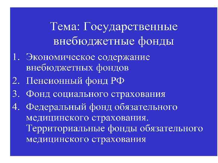 ГОСУДАРСТВЕННЫЕ ВНЕБЮДЖЕТНЫЕ ФОНДЫ – аккумулируют финансовые ресурсы (доходы) и осуществляют расходы для финансового обеспечения реализации конституционных прав граждан: • На социальное обеспечение по возрасту; • Социальное обеспечение по болезни, инвалидности, в случае потери кормильца, рождения и воспитания детей и в других случаях, предусмотренных законодательством РФ о социальном обеспечении; • Социальное обеспечение в случае безработицы; • Охрану здоровья и получения бесплатной медицинской помощи. В России внебюджетные фонды имеют социальный характер и являются фондами системы социальной защиты граждан
