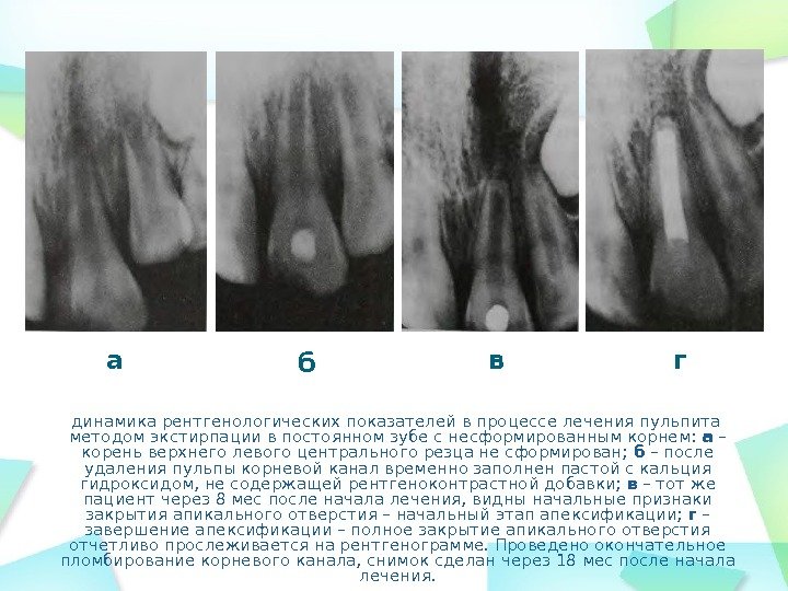 динамика рентгенологических показателей в процессе лечения пульпита методом экстирпации в постоянном зубе с несформированным корнем: а – корень верхнего левого центрального резца не сформирован; б – после удаления пульпы корневой канал временно заполнен пастой с кальция гидроксидом, не содержащей рентгеноконтрастной добавки; в – тот же пациент через 8 мес после начала лечения, видны начальные признаки закрытия апикального отверстия – начальный этап апексификации; г – завершение апексификации – полное закрытие апикального отверстия отчетливо прослеживается на рентгенограмме. Проведено окончательное пломбирование корневого канала, снимок сделан через 18 мес после начала лечения. а б в г