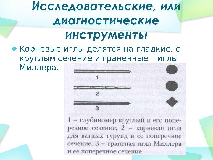 Корневые иглы делятся на гладкие, с круглым сечение и граненные – иглы Миллера.