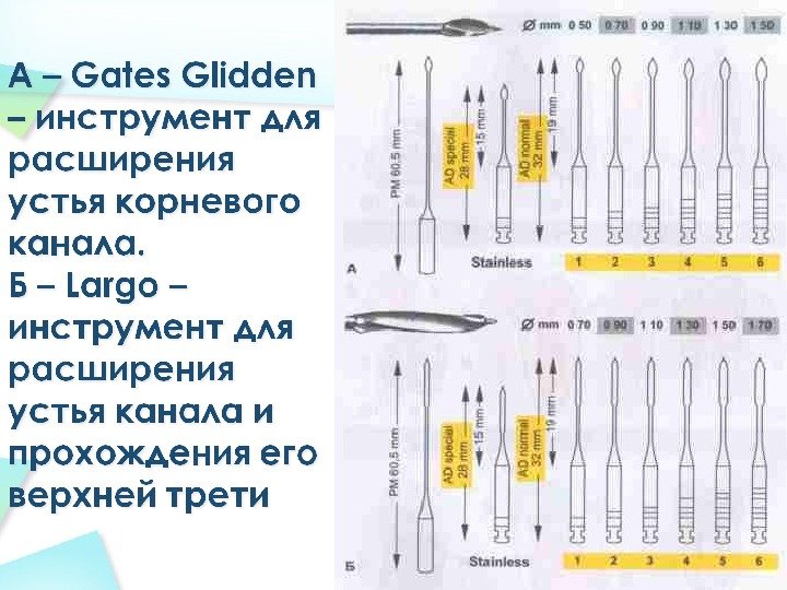 Gates Glidden — имеет небольшую рабочую поверхность на длинном тонком стержне, предназначен для расширения устья и верхней трети канала.