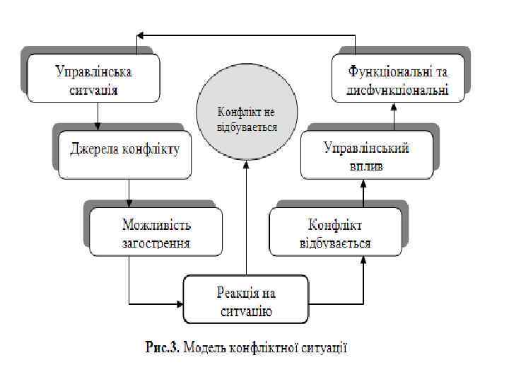 Конфліктна ситуація, що вимагає вирішення, передбачає існування кількох обов'язкових елементів: - учасників конфлікту (дві або більше сторони, що переслідують несхожі чи прямо протилежні цілі); - об'єкт конфлікту (конкретне явище, причина, стан справ, навколо якого розгортається суперечка); - рушійну силу - інцидент (факт зіткнення протилежних сил).