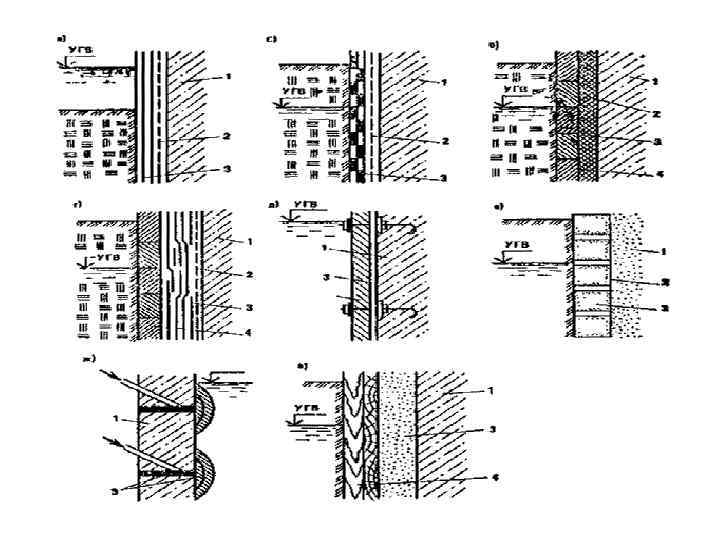 • Оклеечная гидроизоляция (рис. 2, г) применяется преимущественно для защиты подземных помещений от проникновения капиллярной влаги. В качестве оклеечных материалов используются гидроизол, стеклоизол, полиэтиленовая пленка и др. • Монтируемая гидроизоляция (рис. 2, д) представляет собой прикрепленные к защищаемой поверхности механическим способом листы из синтетических, полимерных или металлических материалов. • Пропиточная и инъекционная (рис. 2, е, ж) гидроизоляции устраиваются в тех случаях, когда отсутствует или затруднена возможность доступа к защищаемой поверхности. Эти виды гидроизоляции осуществляются путем пропитки всего слоя грунта (или его части), прилегающего к защищаемой поверхности, гидроизолирующими растворами и композициями, например жидким стеклом и др. • Засыпная гидроизоляция (рис. 2, з) выполняется в виде засыпки толщиной 10 - 50 см в пространство между опалубкой или шпунтом и защищаемой поверхностью гидрофобных порошков. После устройства такой засыпки пазухи котлованов заполняются глинистым грунтом или глинобентонитовыми суспензиями.