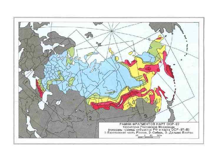 В зависимости от эффекта проявления на поверхности Земли землетрясения классифицируются по их интенсивности в баллах. Ожидаемая для каждого района максимальная величина интенсивности сейсмичность - различна. На территории России созданы карты ОСР-97 -А, ОСР-97 -В и ОСР-97 С отражают 10%-, 5%- и 1%-ную вероятность возможного превышения (или 90%-, 95%- и 99%-ную вероятность непревышения) в течение 50 лет интенсивности сейсмических воздействий, указанных на картах цифрами в баллах шкалы MSK-64, и соответствуют повторяемости сейсмических потрясений в среднем один раз в 500 (карта А), 1000 (В) и 5000 (С) лет.