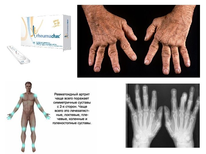 Ревматоидный артрит. Ревматоидный артрит - хроническое аутоиммунное системное воспалительное заболевание соединительной ткани с преимущественным поражением суставов по типу эрозивно-деструктивного полиартрита с последующей деформацией суставов и развитием анкилозов и системным поражением внутренних органов. Поражения суставов Выведенный коэффициент для факторов РА 1 большой 0 2 – 10 больших суставов 1 1 – 3 малых суставов (вне зависимости от состояния больших суставов) 2 4 – 10 малых суставов (вне зависимости от состояния больших суставов) 3 > 10, включая как минимум 1 малый 5 Серологические тесты (для классификации требуется выполнение хотя бы 1 исследования) Негативные результаты тестов: РФ и АЦПА 0 Слабоположительный результат тестов: РФ или АЦПА 2 Высокоположительный результат тестов: РФ или АЦПА 3 Острофазная реакция (для классификации требуется выполнение хотя бы 1 исследования) Результаты тестов: СРБ и СОЭ (норма) 0 Результаты тестов: СРБ или СОЭ (выше нормы) 1 Продолжительность симптомов < 6 недель 0 > 6 недель 1 Ревматоидный артрит подтвержден, если сумма коэффициентов факторов РА ≥ 6/10! Слабо положительными считаются результаты, превышающие N, но не более чем в 3 раза (≤ 3* N); Сильно положительными считаются результаты, превышающие N более чем в 3 раза (>3* N); (Критерии классификации ревматоидного артрита (РА) Американской Коллегии Ревматологии/ Европейской Лиги против Ревматизма, 2010 г. )