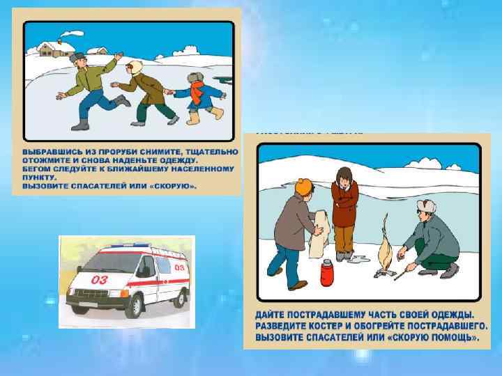 • Осторожно вытащите пострадавшего на лед, и вместе ползком выбирайтесь из опасной зоны. • Ползите в ту сторону – откуда пришли. • Доставьте пострадавшего в теплое место. Окажите ему помощь: снимите с него мокрую одежду, энергично разотрите тело (до покраснения кожи) смоченной в спирте или водке суконкой или руками, напоите пострадавшего горячим чаем. Ни в коем случае не давайте пострадавшему алкоголь – в подобных случаях это может привести к летальному исходу.